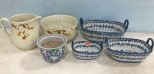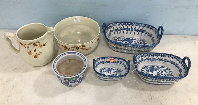 Hall's pottery pitcher, bowl, and three blue & white porcelain handled baskets, made in China. Hall's pottery pitcher, bowl, and three blue & white porcelain handled baskets, made in China.