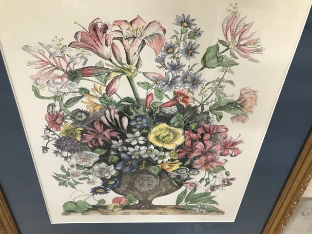 Pen and Watercolor Still Life Bouquet by Pam Dixon, 1990, matted, glassed, gold gilt frame is 23"h., 20"w. Pen and Watercolor Still Life Bouquet by Pam Dixon, 1990, matted, glassed, gold gilt frame is 23"h., 20"w.