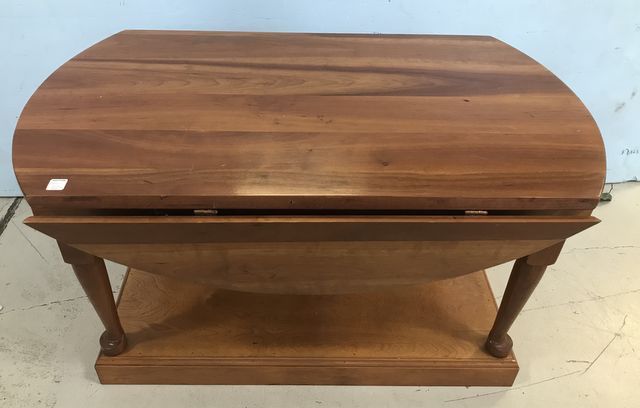 Cherry Drop Leaf Coffee Table On Base, rectangle to oval coffee table attached to wood base, 22"h., 41"w., 24"d unopened. Cherry Drop Leaf Coffee Table On Base, rectangle to oval coffee table attached to wood base, 22"h., 41"w., 24"d unopened.