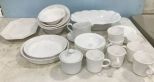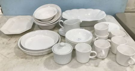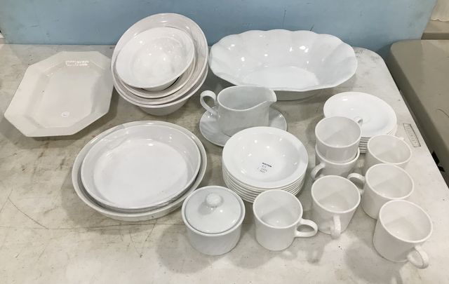 Collection of White China Pieces, mis matching set, bowls, platter, serving bowls, cups, saucers. Collection of White China Pieces, mis matching set, bowls, platter, serving bowls, cups, saucers.