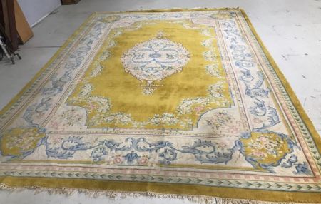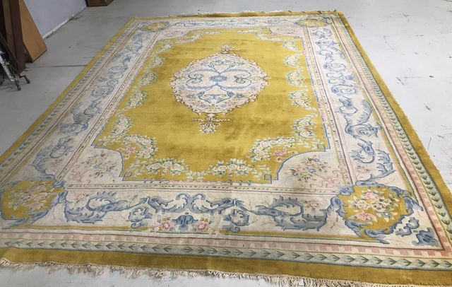 Large Hand Made Yellow Area Rug, wool, yellow, light blue, and pink, needs cleaning, fringes are worn, 10' x 14'. Large Hand Made Yellow Area Rug, wool, yellow, light blue, and pink, needs cleaning, fringes are worn, 10' x 14'.