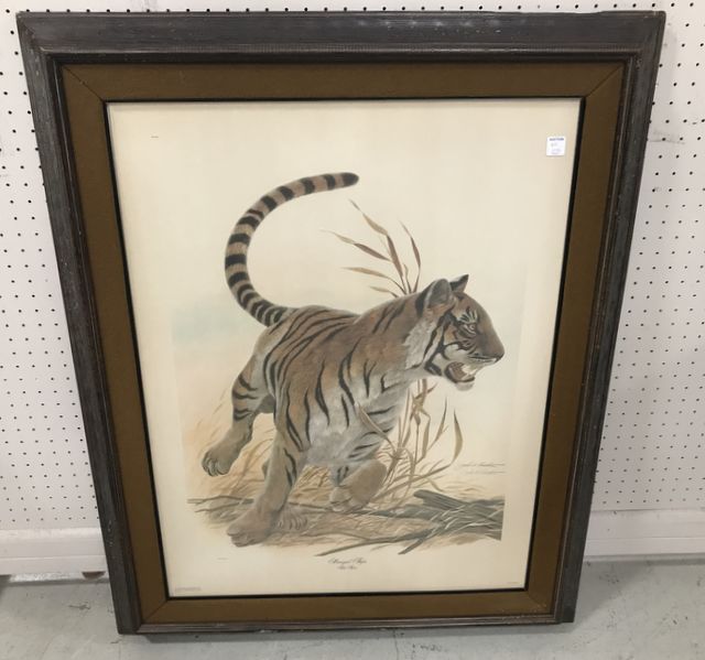Bengal Tiger, Felis Tigris, numbered 2620/5000, signed, plate 1, glassed, wood frame is 41"h., 33"w. Bengal Tiger, Felis Tigris, numbered 2620/5000, signed, plate 1, glassed, wood frame is 41"h., 33"w.