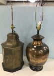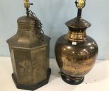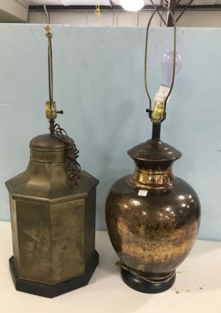 Two large Brass Table Lamps, tarnished brass urn style lamp, and brass polygon container style lamp 33"h. Two large Brass Table Lamps, tarnished brass urn style lamp, and brass polygon container style lamp 33"h.