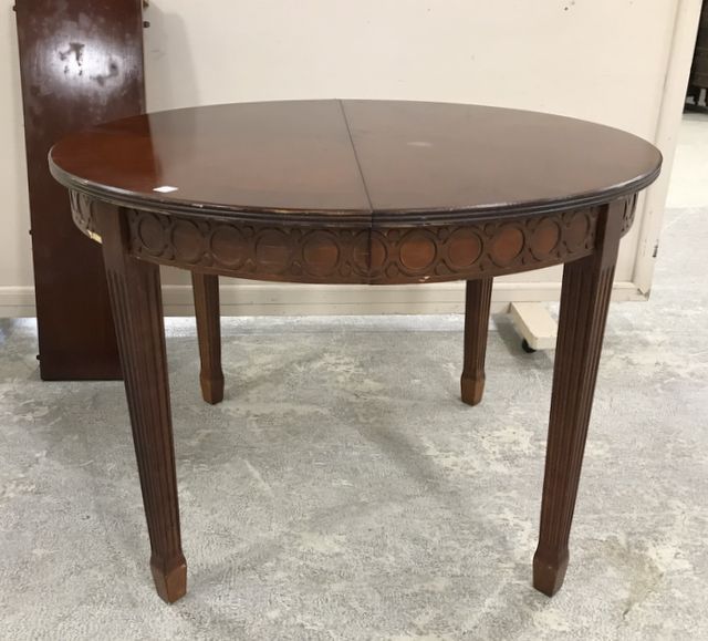 Modern Round Top French Style Dinning Table, with leaf, has trim damage on side, 30"h., 42"dia. Modern Round Top French Style Dinning Table, with leaf, has trim damage on side, 30"h., 42"dia.
