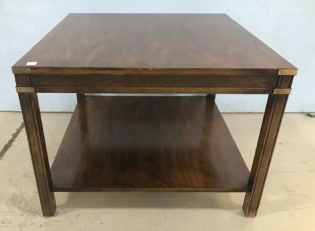 Thomasville Square Lamp Table, two tier, finish wear, brass accent decor, 22"h., 30"sq. Thomasville Square Lamp Table, two tier, finish wear, brass accent decor, 22"h., 30"sq.