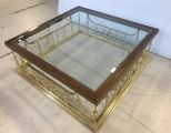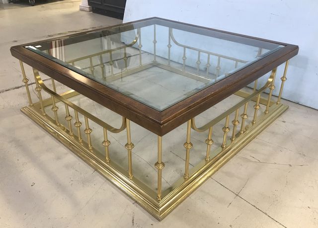 Brass Base Square Glass Top Coffee Table, wood top frame with beveled glass inset top, brass spindle design base, 15"h., 42"sq. Brass Base Square Glass Top Coffee Table, wood top frame with beveled glass inset top, brass spindle design base, 15"h., 42"sq.