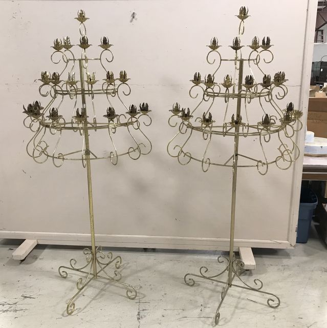Two Brass Color Metal Candle Stands, adjustable height, 20 candle holder slots. Two Brass Color Metal Candle Stands, adjustable height, 20 candle holder slots.