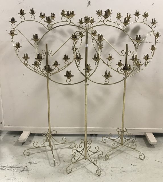 Two Brass Color Heart Candle Stands and Brass Color Circle Design Candle Stand, adjustable height, 20 candle holders slots. Two Brass Color Heart Candle Stands and Brass Color Circle Design Candle Stand, adjustable height, 20 candle holders slots.
