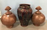 Pair of gold painted decorative vases with lids (one lid has been reglued), and Art glass tall vase 16"h. Pair of gold painted decorative vases with lids (one lid has been reglued), and Art glass tall vase 16"h.