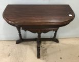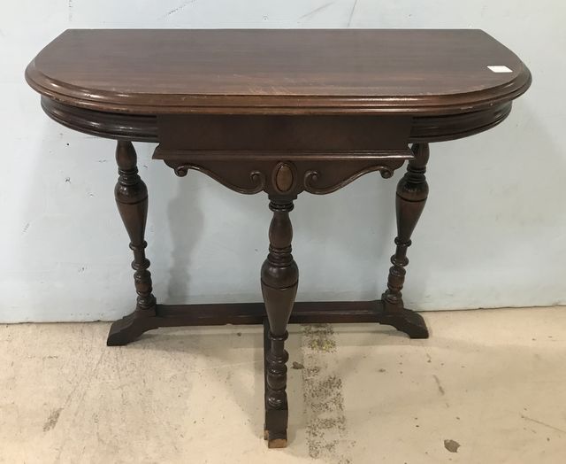 1930's Depression Era Demi Lune Wall Console Stand, three leg, front foot is chipped, has wear, 25"h., 27"w. 13"d. 1930's Depression Era Demi Lune Wall Console Stand, three leg, front foot is chipped, has wear, 25"h., 27"w. 13"d.