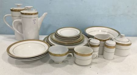 Essex Gold China Set, housewares international, made in China, Dinner plate, two salad plates, three bowls, serving bowl, creamer, sugar, salt & pepper, cups, two pitchers. Essex Gold China Set, housewares international, made in China, Dinner plate, two salad plates, three bowls, serving bowl, creamer, sugar, salt & pepper, cups, two pitchers.