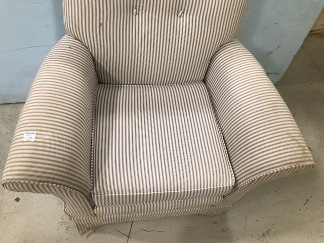 Striped Upholstered Arm Chair, tufted button, skirted, dirty fabric. Striped Upholstered Arm Chair, tufted button, skirted, dirty fabric.