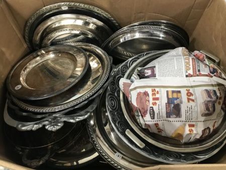Huge Lot of Silver Plate Serving Assorted Trays, all different kinds and sizes. Huge Lot of Silver Plate Serving Assorted Trays, all different kinds and sizes.