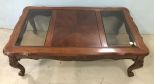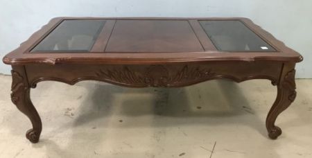 Modern French Style Rectangle Coffee Table, two glass panels, factory carved shell designs, has scratches, 16"h., 48"w., 17"d. Modern French Style Rectangle Coffee Table, two glass panels, factory carved shell designs, has scratches, 16"h., 48"w., 17"d.