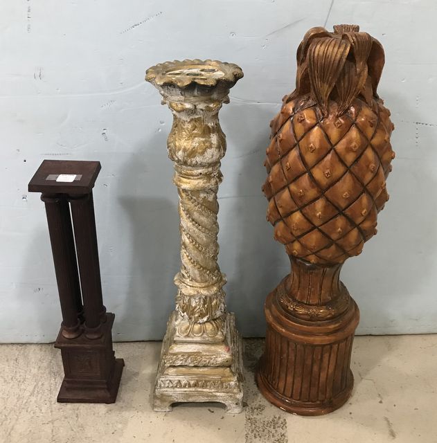 Pineapple plaster decor 27"h., painted gold white painted candle stand 24"h., metal modern column stand 18"h. Pineapple plaster decor 27"h., painted gold white painted candle stand 24"h., metal modern column stand 18"h.