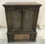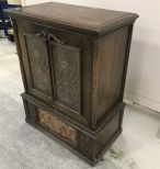 Vintage radio cabinet, empty, no radio, double door with ornate carvings, bottom needlework for speaker slot, finish is worn, 41"h., 31"w., 18"d. Vintage radio cabinet, empty, no radio, double door with ornate carvings, bottom needlework for speaker slot, finish is worn, 41"h., 31"w., 18"d.