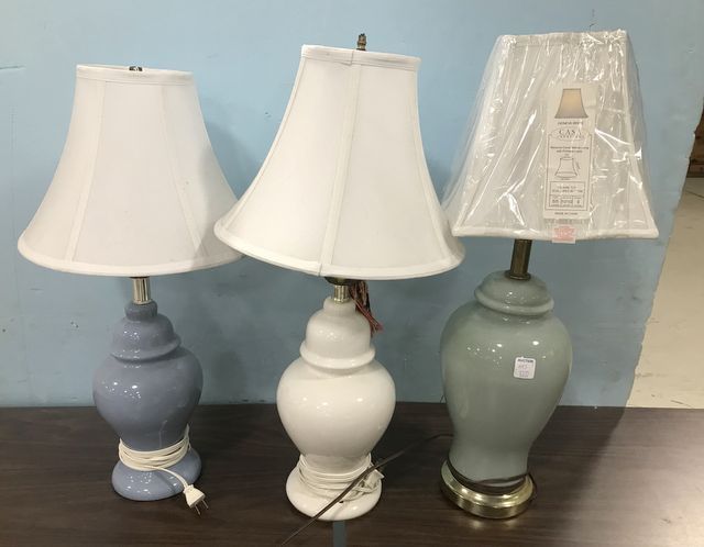 Three Gray, White, and Blue Glass Table Lamps, vase style lamps, 25"h. Three Gray, White, and Blue Glass Table Lamps, vase style lamps, 25"h.