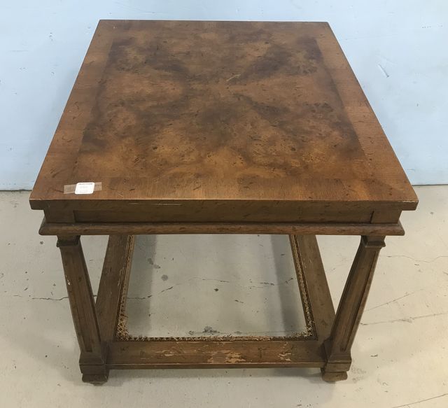 1980's Bird Eye Maple Finish Two Tier Side Table, has finish wear, bottom tier cane is missing, 21"h., 22"w., 26"d 1980's Bird Eye Maple Finish Two Tier Side Table, has finish wear, bottom tier cane is missing, 21"h., 22"w., 26"d