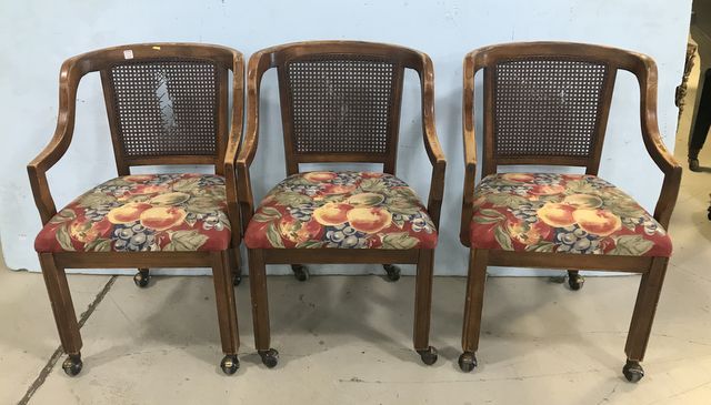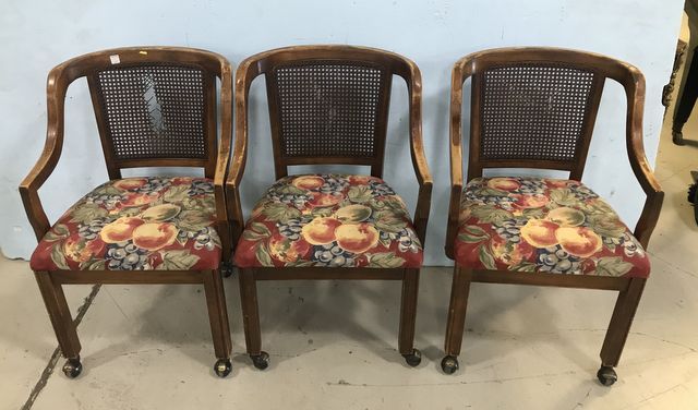 Three Vintage Cane Back Club Chairs, on wheels, cane is damaged, worn finish, fruit Fabric seats, 33"h. Three Vintage Cane Back Club Chairs, on wheels, cane is damaged, worn finish, fruit Fabric seats, 33"h.