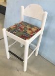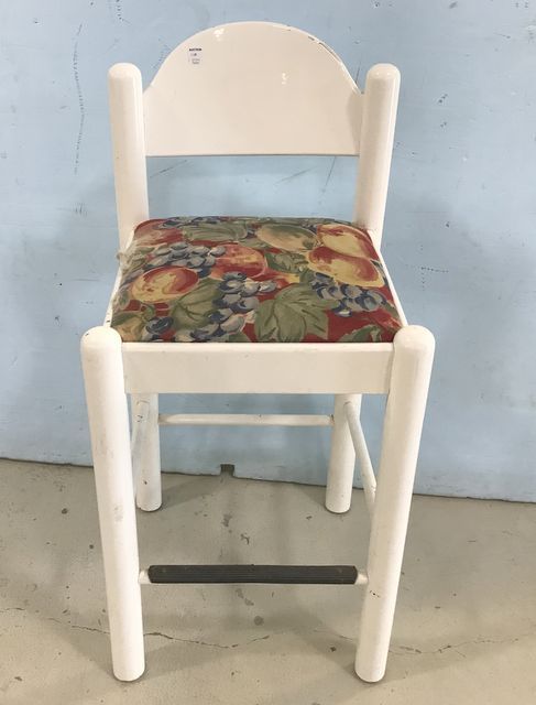 White Painted Bar Stool, fruit fabric cushion, some chips on paint, 36"h. White Painted Bar Stool, fruit fabric cushion, some chips on paint, 36"h.