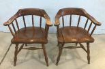 Vintage Spindle Barrel Chairs, pair, worn finish, one has split seat, 28"h. Vintage Spindle Barrel Chairs, pair, worn finish, one has split seat, 28"h.