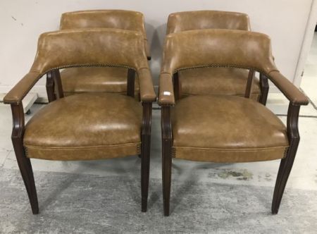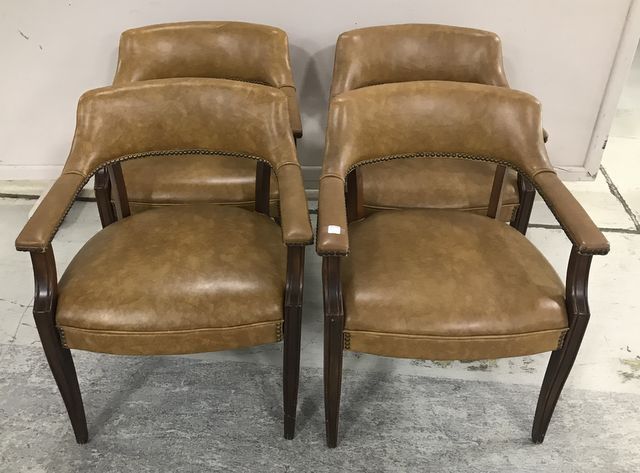 Four Office Vinyl Arm Chairs, tacked border, has wear, 30"h. Four Office Vinyl Arm Chairs, tacked border, has wear, 30"h.