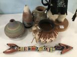 Buffalo Dancer Jacidal Figure, four southwest pottery pieces, paper mache hand painted arrow. Buffalo Dancer Jacidal Figure, four southwest pottery pieces, paper mache hand painted arrow.