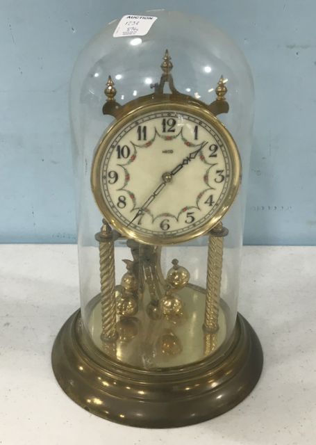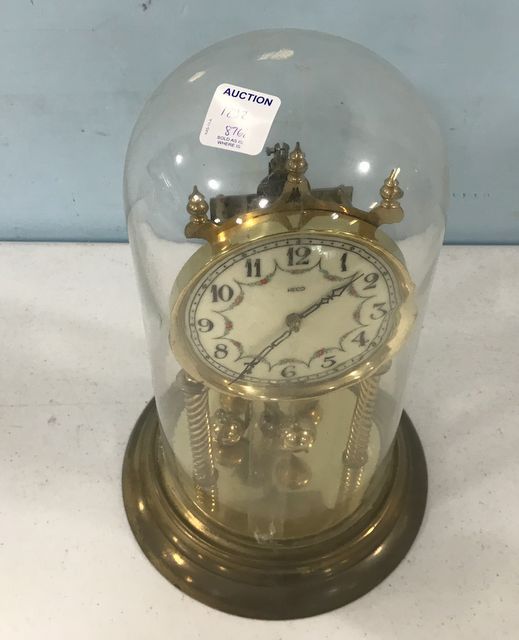 Heco Anniversary Clock, glass dome, missing pendulum rod, 12"h. Heco Anniversary Clock, glass dome, missing pendulum rod, 12"h.