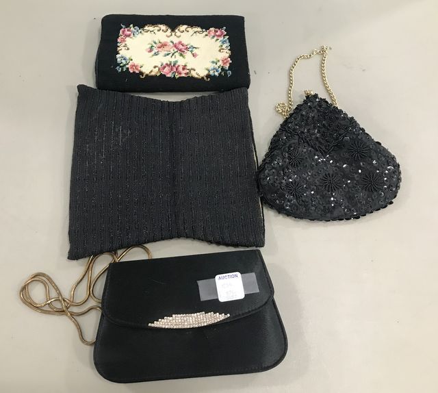 Four vintage purses, needle point purse, beaded purse, and two others. Four vintage purses, needle point purse, beaded purse, and two others.
