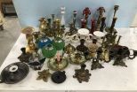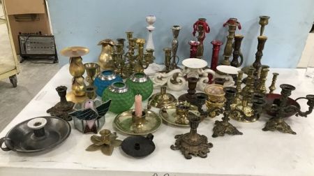 Large Collection of Assorted Candle Holders, brass candle holders, glass holders, wood holders, different sizes. Large Collection of Assorted Candle Holders, brass candle holders, glass holders, wood holders, different sizes.