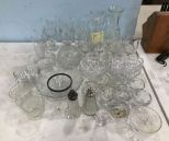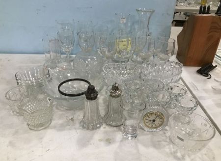 Group of Clear Glass Serving Pieces, wine glasses, bowls, serving bowls, vases, salt & pepper, clock, heart shaped bowls, bedside carate. Group of Clear Glass Serving Pieces, wine glasses, bowls, serving bowls, vases, salt & pepper, clock, heart shaped bowls, bedside carate.