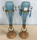 Vintage Metal Blue Glass Vase Stand, rustic metal stands with light blue flower vases, 13"h. Vintage Metal Blue Glass Vase Stand, rustic metal stands with light blue flower vases, 13"h.