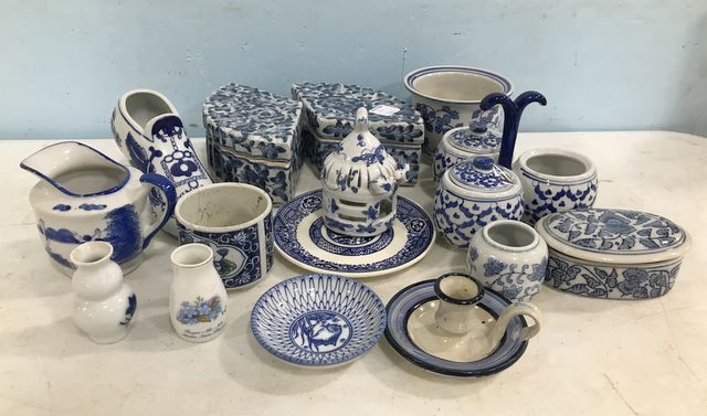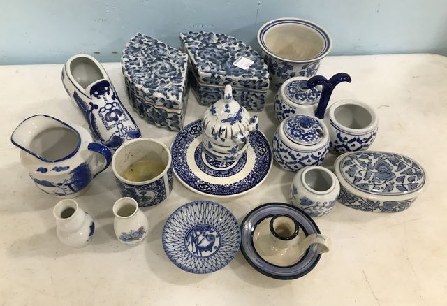 Blue and White Pottery Pieces, jars, cups, shoe, vases, plates. Blue and White Pottery Pieces, jars, cups, shoe, vases, plates.