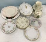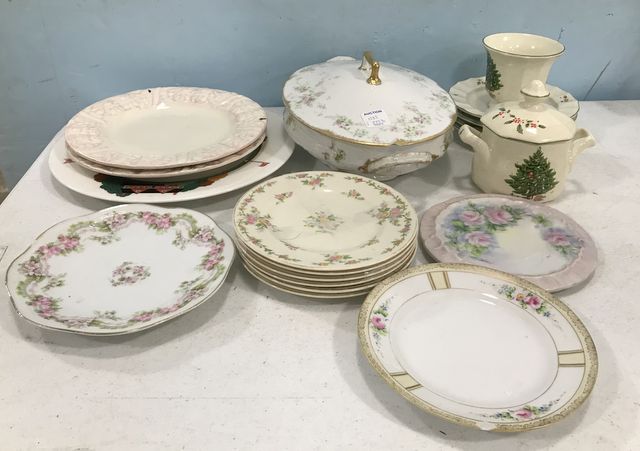 Individual Pieces of China, Haviland tureen, floral painted stand, old ivory dessert plates, nippon plate with chip, holiday sugar, cup, and plates. Individual Pieces of China, Haviland tureen, floral painted stand, old ivory dessert plates, nippon plate with chip, holiday sugar, cup, and plates.