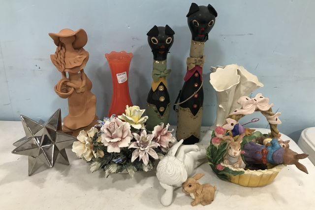 Pottery lady statue, vase, art cat vases, capidomonte style flowers, angel ceramic figure, easter basket, flute vase. Pottery lady statue, vase, art cat vases, capidomonte style flowers, angel ceramic figure, easter basket, flute vase.