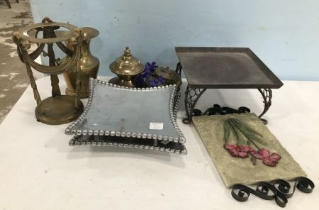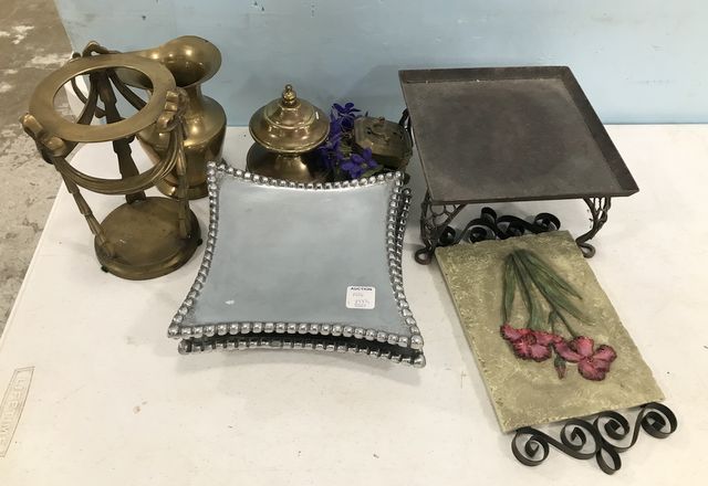 Brass stand, pitcher, trinket box, lid, two metal plates, wall art, metal planter stand. Brass stand, pitcher, trinket box, lid, two metal plates, wall art, metal planter stand.