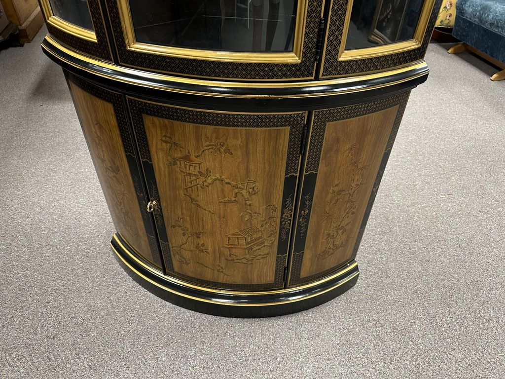 Drexel Heritage Et Cetera Corner Display Cabinet, glass shelves, Chinoiserie Decorated, lighted, good condition, 78"h., 34"w, Location left Wall Drexel Heritage Et Cetera Corner Display Cabinet, glass shelves, Chinoiserie Decorated, lighted, good condition, 78"h., 34"w, Location left Wall