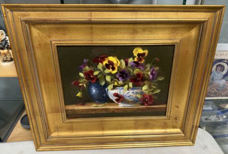 Lucy Mazzaferro (Mississippi Artist) Still Life Flower Painting, on board, gold gilt framed, frame is 22"h., 25"w, piece is 12"h., 16"w, Location Left Wall Lucy Mazzaferro (Mississippi Artist) Still Life Flower Painting, on board, gold gilt framed, frame is 22"h., 25"w, piece is 12"h., 16"w, Location Left Wall