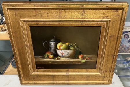 Lucy Mazzaferro (Mississippi Artist) Still Life Flower Painting, on board, gold gilt framed is 22"h., 25"w, piece is 12"h, 16"w, Location Left Wall Lucy Mazzaferro (Mississippi Artist) Still Life Flower Painting, on board, gold gilt framed is 22"h., 25"w, piece is 12"h, 16"w, Location Left Wall