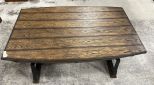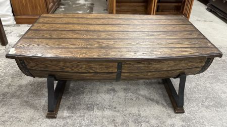 Modern Reproduction Oak Whiskey Barrel Coffee Table, has side drawers, iron base, 19"h., 52"long, 32"w. Location Row 5 Modern Reproduction Oak Whiskey Barrel Coffee Table, has side drawers, iron base, 19"h., 52"long, 32"w. Location Row 5