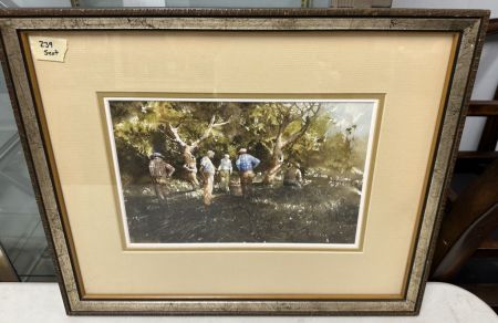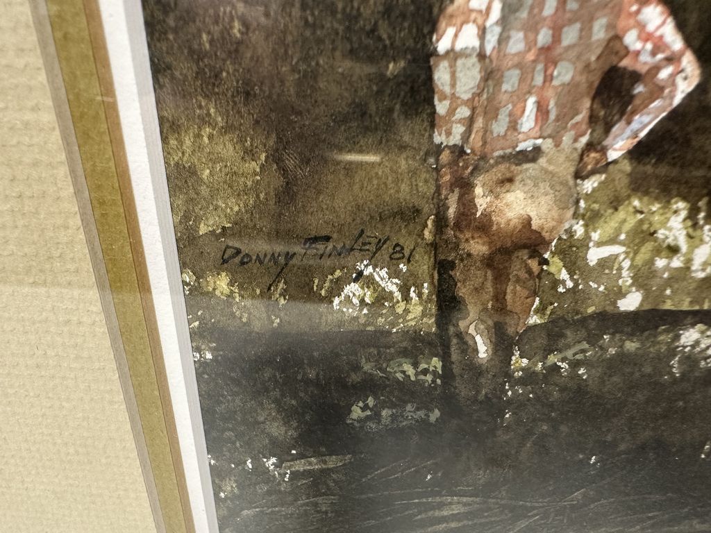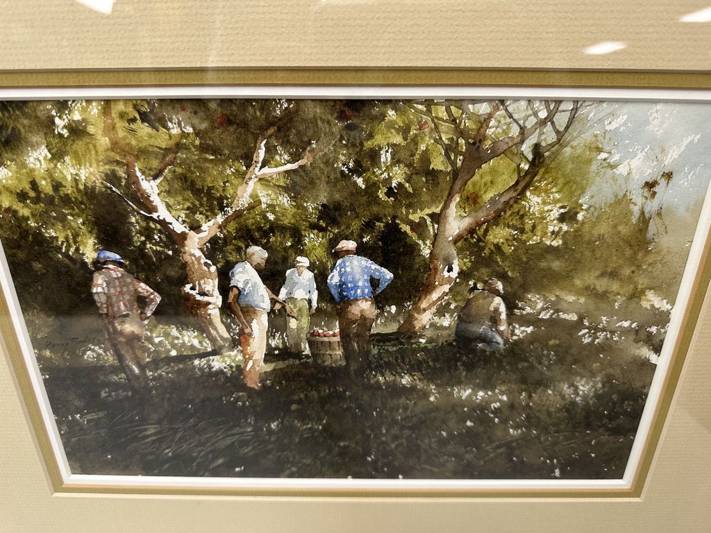 Donny Finley 1981 Watercolor Apple Picking, Alabama Artist, matted, framed, 16"h., 20"w, Location Left Wall Donny Finley 1981 Watercolor Apple Picking, Alabama Artist, matted, framed, 16"h., 20"w, Location Left Wall