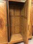 Large Three Door Biedermeier Neoclassic Wardrobe , triple door, German, large oval center door mirror, breaks down, one door has been repaired, brass ormolu, burl finish, has some age wear, has shelves, 93"h., 77"w., 22"d. Location Left Office Large Three Door Biedermeier Neoclassic Wardrobe , triple door, German, large oval center door mirror, breaks down, one door has been repaired, brass ormolu, burl finish, has some age wear, has shelves, 93"h., 77"w., 22"d. Location Left Office