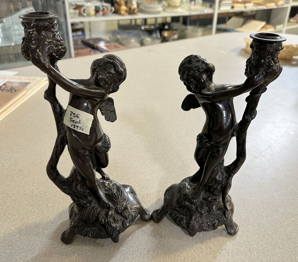 Pair of Bronze Cherub Candlesticks, 12"h, Location Back Metal Shelves Pair of Bronze Cherub Candlesticks, 12"h, Location Back Metal Shelves