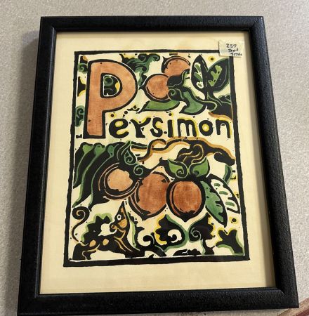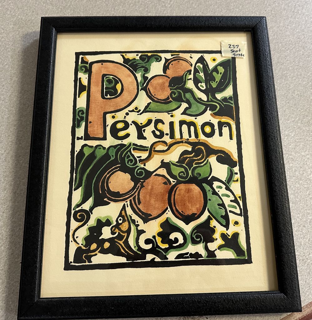 Walter Anderson P Alphabet Print, Persimon, hand colored by an artist, framed, 15"h., 12"w, Location Back Metal Shelves Walter Anderson P Alphabet Print, Persimon, hand colored by an artist, framed, 15"h., 12"w, Location Back Metal Shelves