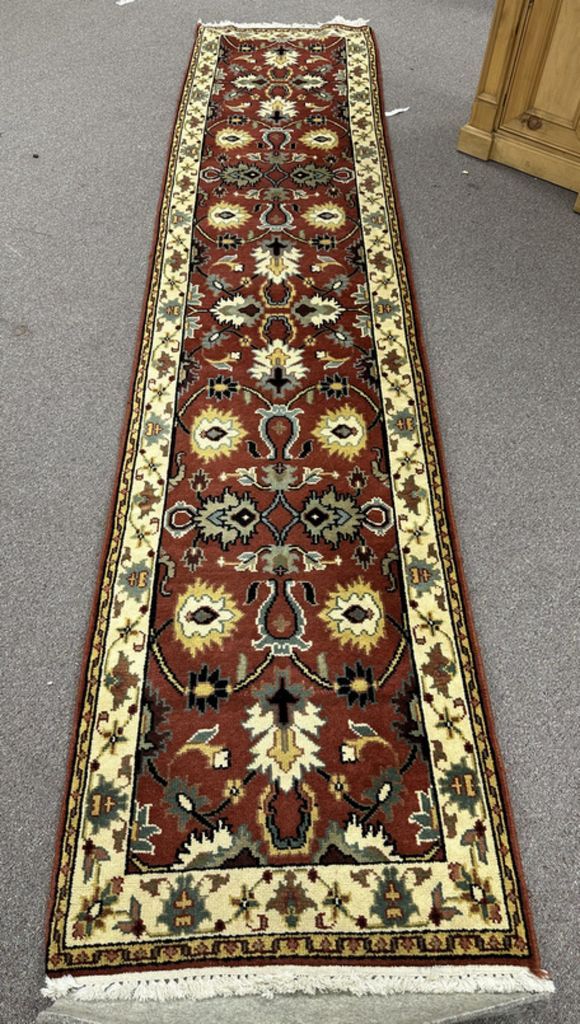 2'6 x 11'7 Oushak Hand Knotted Wool Runner, good condition, Location Left Office 2 2'6 x 11'7 Oushak Hand Knotted Wool Runner, good condition, Location Left Office 2