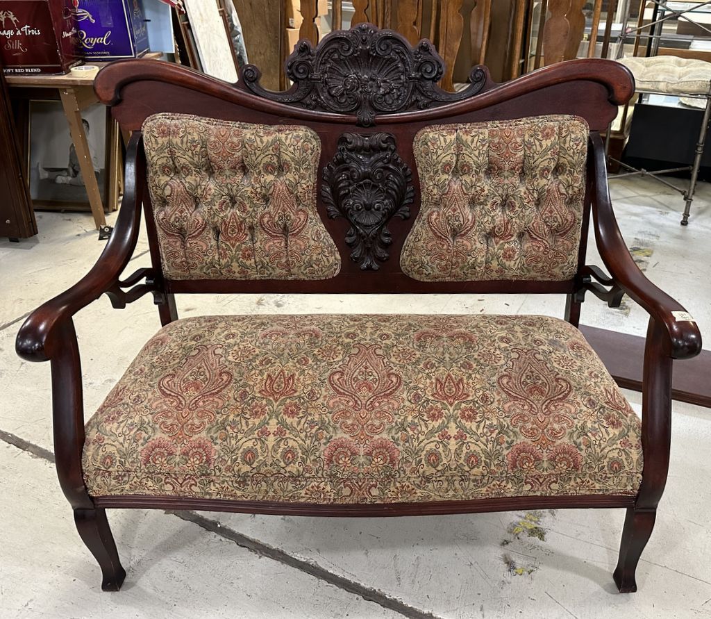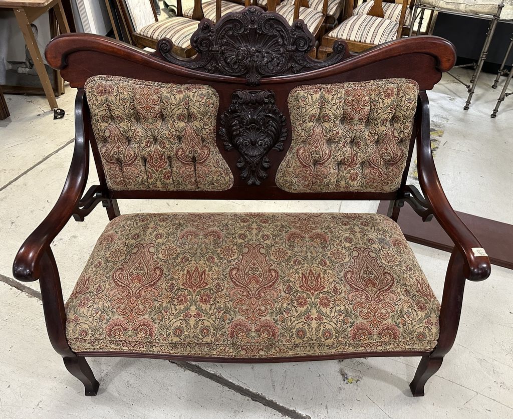 Antique Victorian Style Parlor Settee, mahogany, carved back, good condition, 47"h., Location Row 2 Antique Victorian Style Parlor Settee, mahogany, carved back, good condition, 47"h., Location Row 2