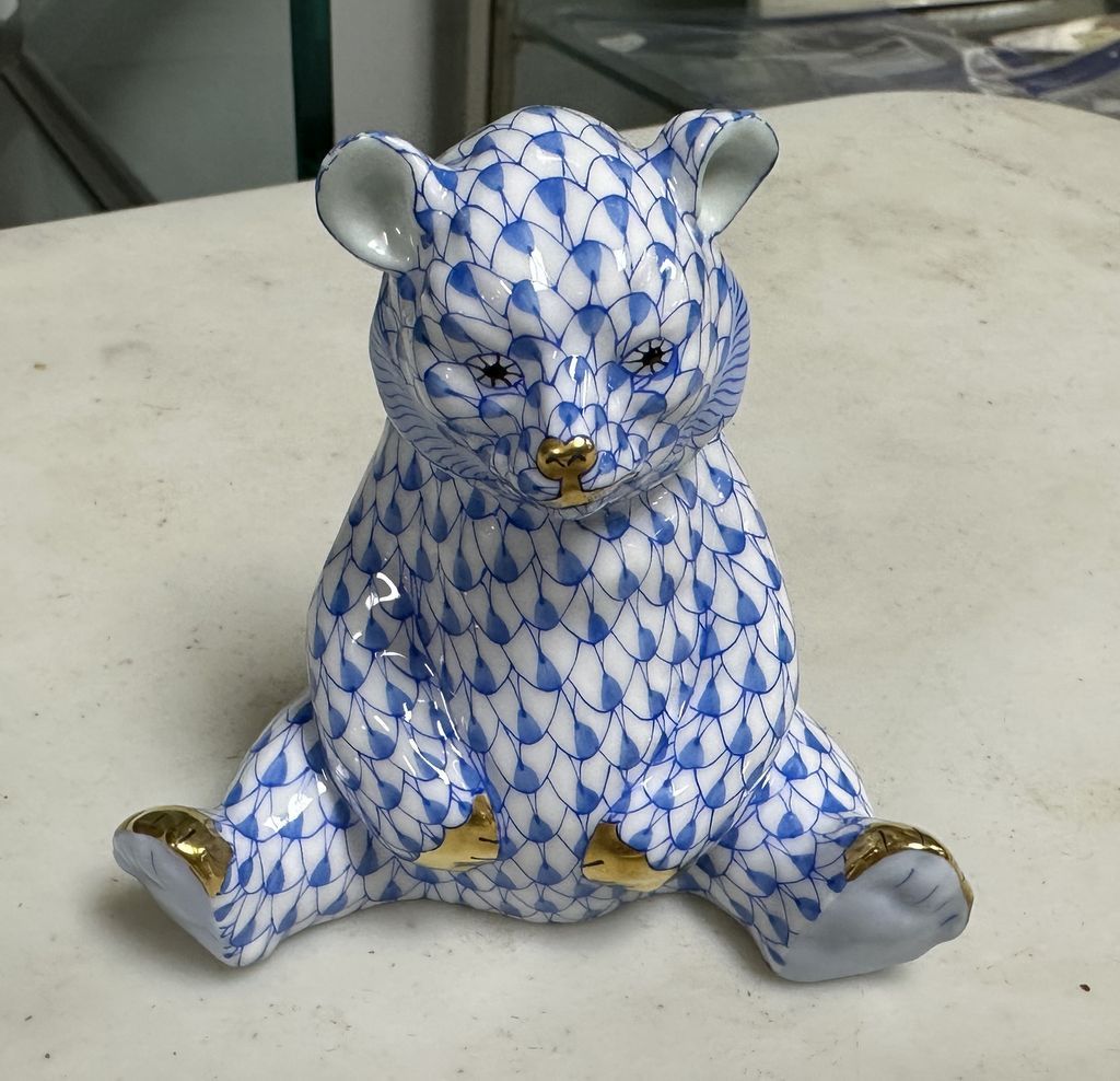 Herend Hand Painted Baby Sitting Bear, blue fishnet, 153c1-0-00/VHB, good condition, 4"h, Location case by Office Herend Hand Painted Baby Sitting Bear, blue fishnet, 153c1-0-00/VHB, good condition, 4"h, Location case by Office