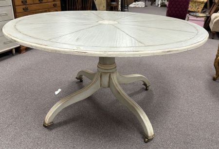 Reproduction Distressed Painted Pedestal Dining Table, 29"h., 56"dia, factory finish. Location Left Office 1 Reproduction Distressed Painted Pedestal Dining Table, 29"h., 56"dia, factory finish. Location Left Office 1