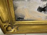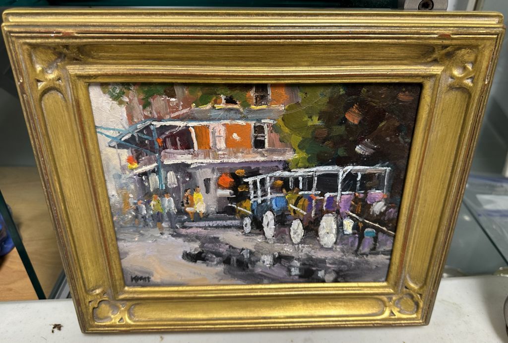 Joel Knapp (Gallatin, Tennessee) Painting of Busy Street, on board, gold gilt framed, 11"h., 13"w, Location Left Wall Joel Knapp (Gallatin, Tennessee) Painting of Busy Street, on board, gold gilt framed, 11"h., 13"w, Location Left Wall