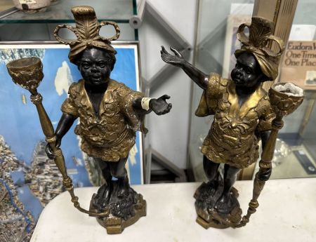Pair of Blackamoor Cast Bronze Candlestick Statues, 16"h, Location Front Left Shelves Pair of Blackamoor Cast Bronze Candlestick Statues, 16"h, Location Front Left Shelves